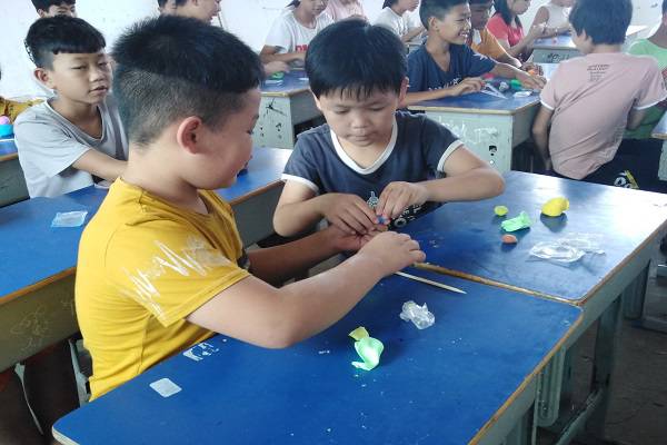 伟德国际1949学生社团联合会赴衡阳市祁东县成龙学校暑期实践团进行了第一次美工课教学。主要由美术老师贡浩天教学黏土制作和手工折纸。