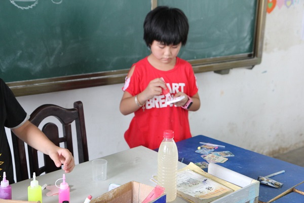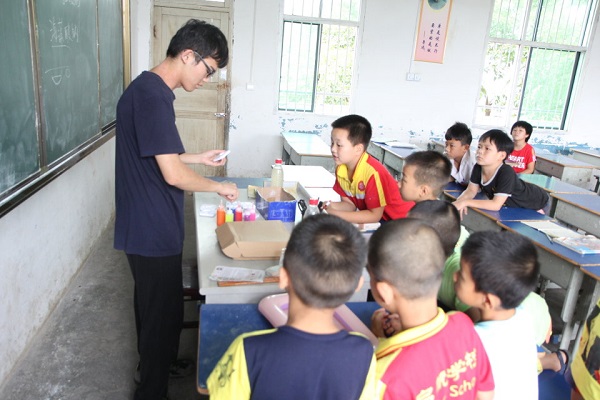 苏文韬给孩子们讲述实验的原理,并讲解实验操作。苏文韬先给孩子们做演示实验,然后给孩子们分发实验器材和药品,孩子们开始自己动手做实验,苏文韬在一旁指导实验操作并负责孩子们的安全。