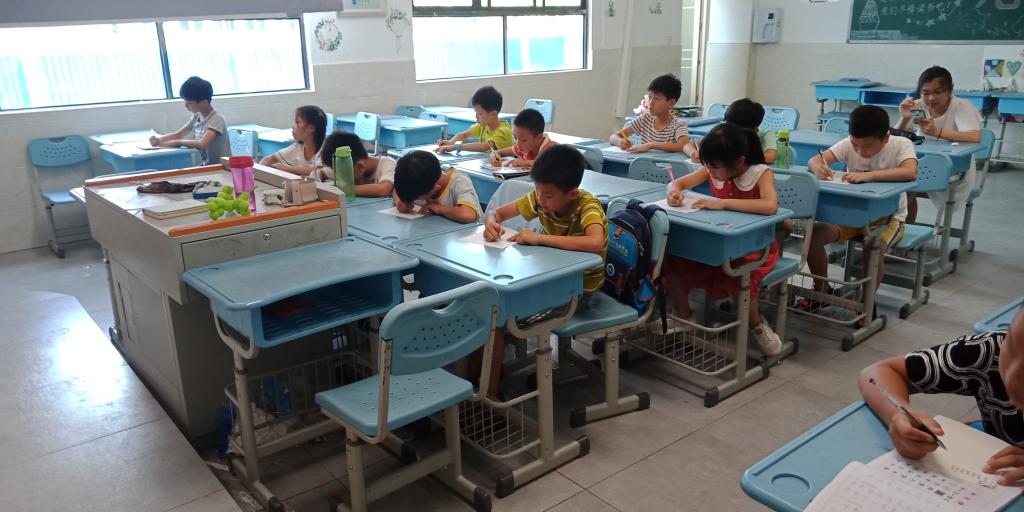 蓝杨浚书写了一篇硬笔书法作品,向学生们进行展示。陈志霞向同学们讲解握笔姿势,并对学生们的姿势进行指导并给两个班级的学生安排了不同的比赛内容,学生根据比赛内容书写并上交作品。最后,实践团的队员对学生的作品进行了等级评定与评价。