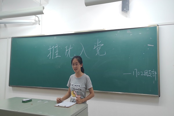刘玉姣向全体支部成员汇报由支部委员会考察推优对象的基本情况。龚文慧、郑晚君、肖嘉晏敏、刘湘依次上台做自我介绍,均表示会从自身出发,积极向党组织靠拢,学习党员的思想道德品质的决心。