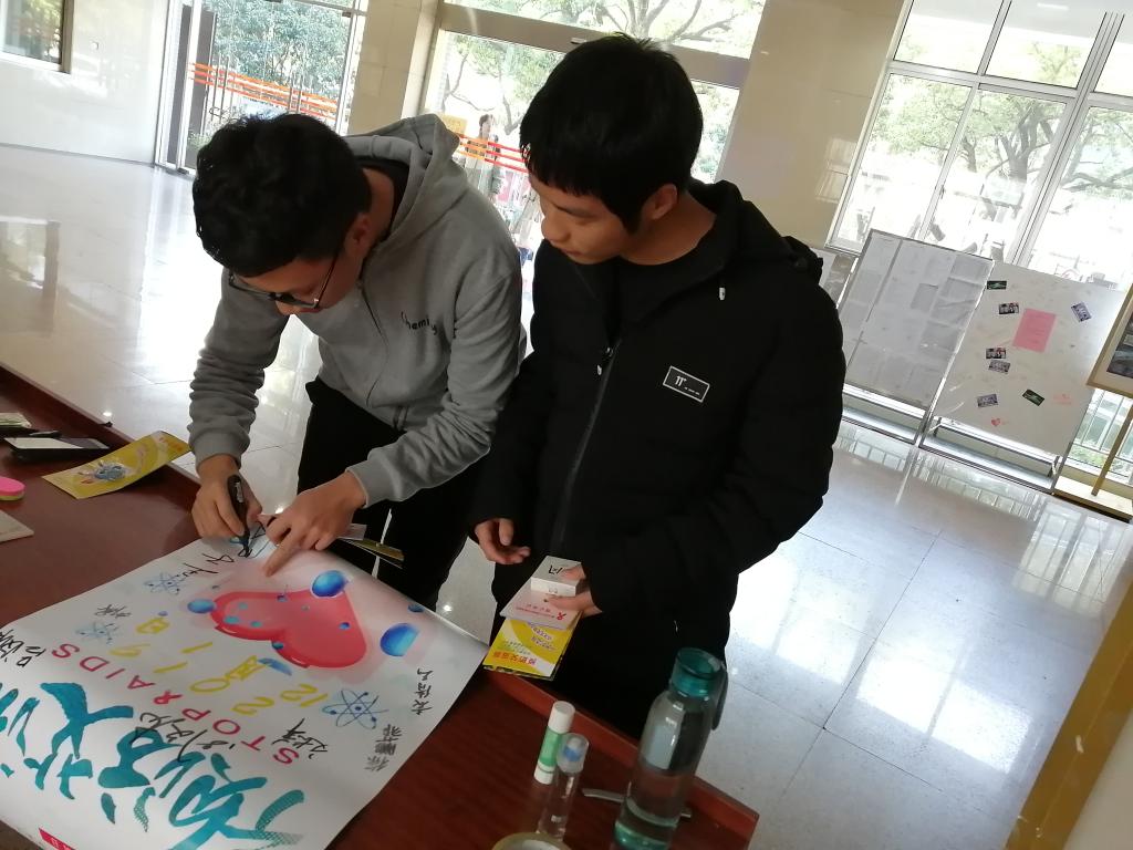 在此次活动前,生服部制作了宣传预防艾滋病的特色海报。在活动中,生服部号召来往的行人在海报上进行签名,并在“化”语板上留下自己对艾滋病人想说的话,同时生服部对参与的同学们提供了一定数量的小礼品,提高了活动的参与度。