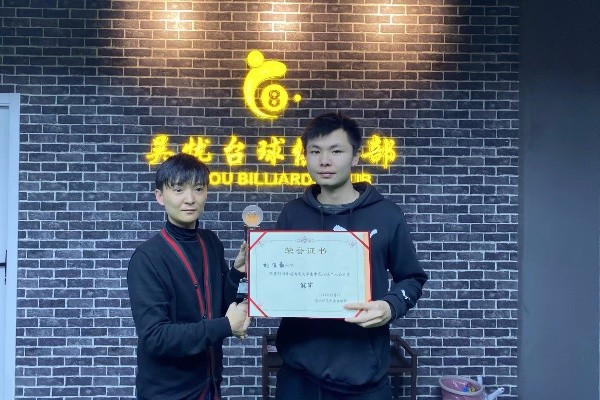 12月7日9时30分,理事长唐美男组织所有参赛选手签到抽签,比赛准时开始。经过第一天的激烈的淘汰赛,32强诞生。8日,比赛采取双败淘汰制,选手们角逐数十场,伍靖选手和刘佳豪选手脱颖而出,冠亚军选手诞生。两名选手势均力敌,打满了十七局,台球桌前围满了观众,最终伍靖选手完美的将黑八击入袋中,夺得了此次比赛的冠军,现场掌声雷动。伍靖选手获得了亚军,季军和殿军分别为黄江龙和杨建国。在此次比赛期间,举办方还举办了抽奖活动,抽取了三位同学,各自获得了品牌球杆一根。