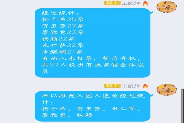 此次会议由班长王鹏辉和团支书张琰共同主持。张琰先讲述关于参加团校的意义与要求。接下来竞选者以竞选演讲的形式表明自己的意愿和想法。支部成员通过差额投票的形式选出得票数高的五位。由王鹏辉统计并宣布出本次竞选成功者。他们分别是杨予希,贺玉芳,廖雅思,米仁萨和杨颖。
