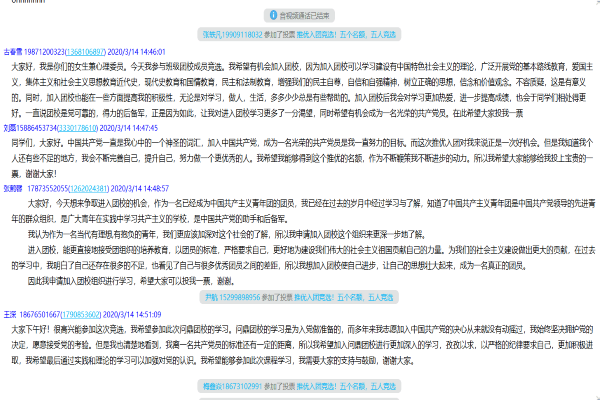此次活动由班长向皓主持,候选人依次在语音通话里发言,并同时把文字形式的发言稿发到通知群里,确保同学能够全面了解其发言内容。在所有候选人发言完毕后,同学通过群投票的方式,选出最后的人选分别是:魏世远、刘磊、张鹤馨、王深、古春雪。
