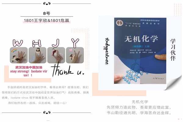 在三月这个春暖花开的季节,恰逢遇到全民共同战疫的时期,为了让同学们心中对同学、朋友的思念也得以表诉,化工院学生会女生部发布活动通知要求以及给同学们提供一些合拍模板,同学们积极报名参加,在收集完所有报名材料后,学生会外宣部对材料进行微信推送的编辑,并发布微信推送让同学们转发投票,票选出12组人气小组之后由女生部进行最后的评分择优,最终公布前五名的小组结果。