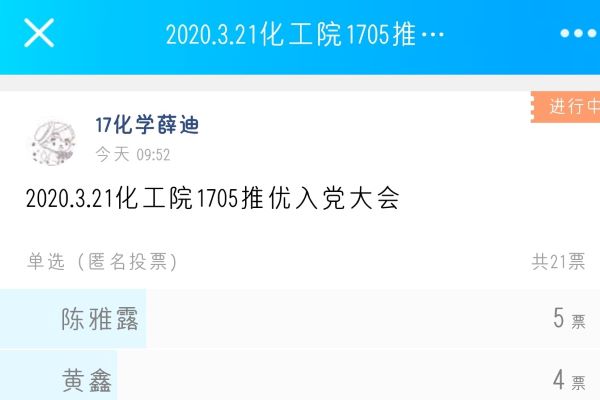 团支书桑晓茹主持此次会议。桑晓茹先介绍此次推优入党的六位候选人。候选人陈雅露、黄鑫、裴鋆、王馨冉、严丽、何君明相继发言,针对品德、学习、入党原因等方面进行自我陈述。陈述完毕后,在监督员的监督下,本班21位同学进行民主不记名线上投票,得到六位同学的选票数,并排出次序。