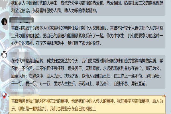 活动期间,同学们观看了两个有关雷锋精神的短片,并在对话框中发表自己的见解和看法。随后,同学们关闭群课堂,在班级群内以文字形式和同学、老师讨论雷锋和雷锋精神给人们带来的影响,以及如何践行雷锋精神。