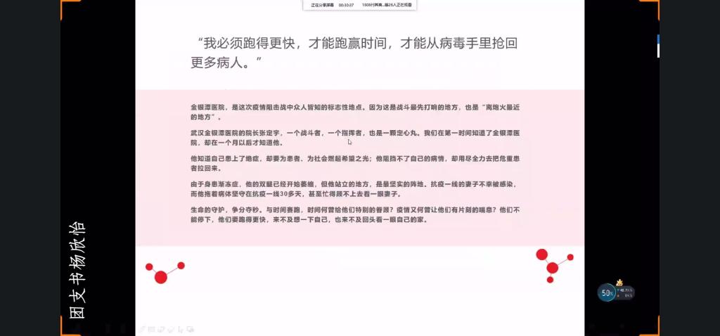 此次团日活动的主题是“疫情中的逆行者”,杨欣怡表示春节期间突然爆发的新型冠状病毒来势汹汹,不光打乱了人们正常的生活,更夺走了一个个宝贵的生命,并邀请同学们分享疫情期间身边的逆行者,同学们积极发言,向为疫情工作付出无数牺牲和努力的人民英雄致敬,向疫情中的逆行者致敬!