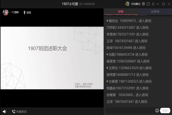 (通讯员 杨诗薇)4月25日15时20分,1907班在班级通知群内准时进行述职大会。此次会议由班长向皓主持,同学通过群通话加入到活动中。
