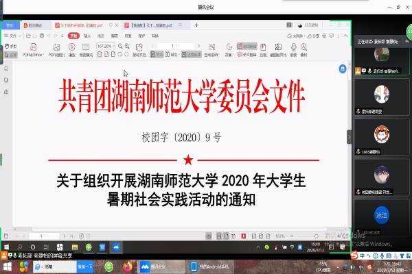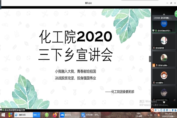 (通讯员 谢雨雯)7月13日19时30分,伟德国际19492020年三下乡暑期社会实践宣讲会在腾讯会议举行。院团委书记屈杜炜、学工办付玉丽、学工办杨魏鹏出席此次会议。此次活动由团委素质拓展部组织策划,由周敏主持。