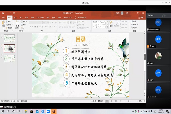 秦静怡主要安排了近期有关调查问卷的任务。会议上小组成员一起讨论了调研问题,并且尽快用问卷星制作出调查问卷进行发放。小组成员一起讨论了如何制作有关保护野生动物的传单,安排了市场走访调查以便了解野生动物的贩卖。秦静怡还安排了相关组员进行野生动物的现状调查。