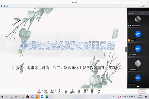 (通讯员 唐嘉璇)8月15日20点,“追求绿色时尚,找寻百家欢乐”——伟德国际victor1946化工院暑期社会实践团的社会实践成果总结会于腾讯会议举行,会议为期30分钟。实践团全体成员参加会议。