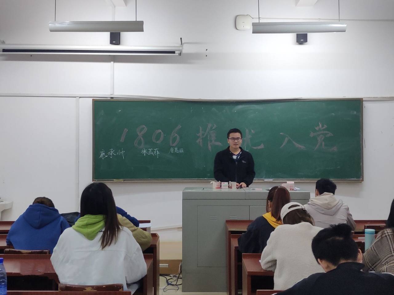 会议伊始,赵青介绍此次推优入党的六位候选人。候选人康承帅、朱芸菲、唐嘉丽、张科、赵青、秦紫曦相继上台,针对品德、学习、入党原因等方面进行自我陈述。陈述完毕后,经本班17位同学民主不记名投票,得到六位同学的选票数,并排出次序。