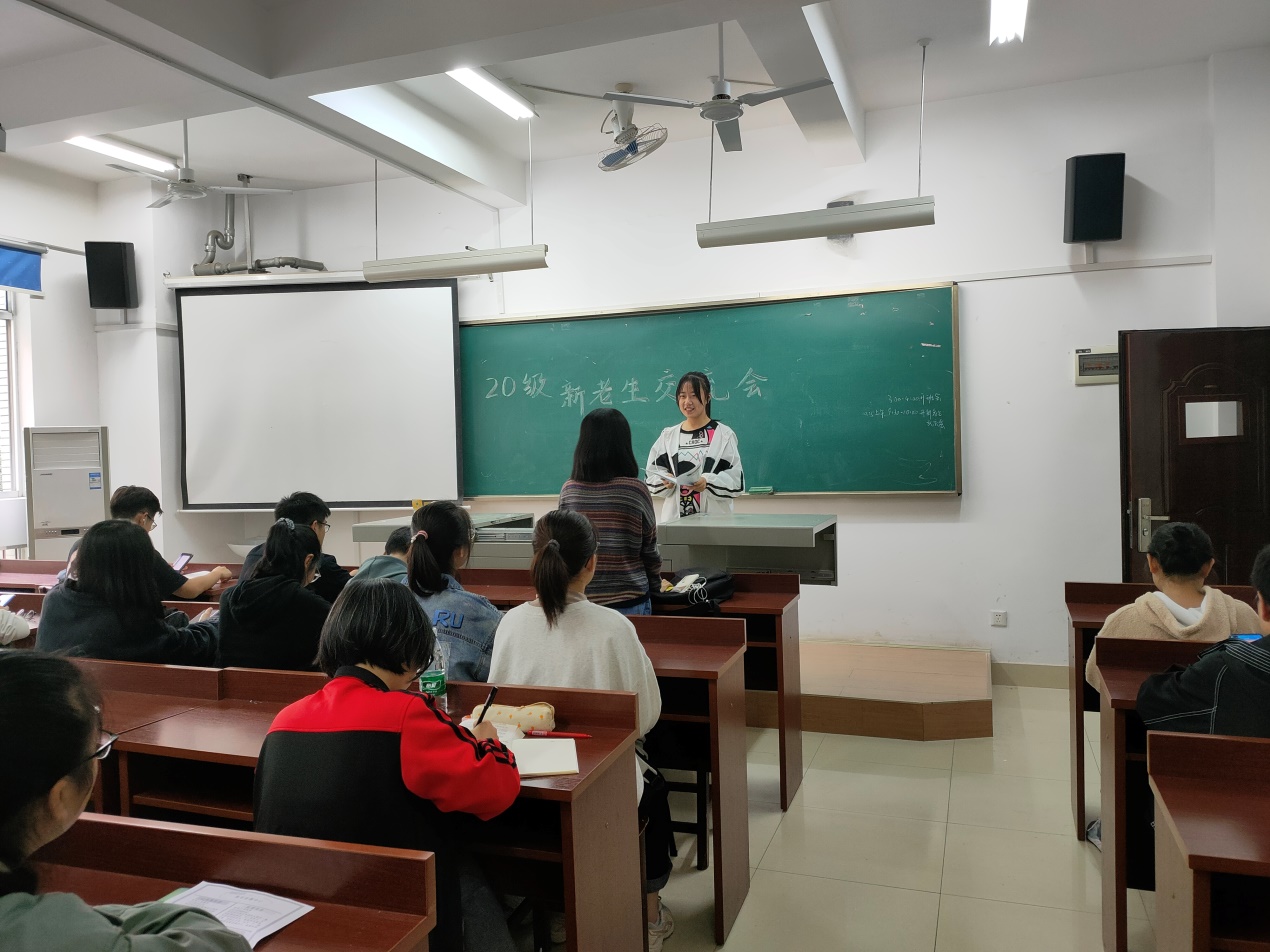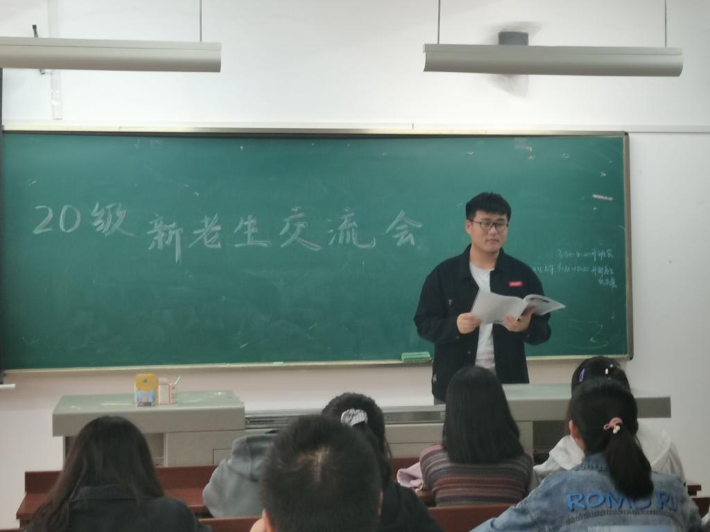 新老生交流会由2002班学习委员杨柳柳主持。活动内容主要是18级的三位学长学姐给同学们解答之前收集好的问题,期间讲述了自己的学习经历和研究方向,分享了一些关于学习和生活的建议,并对同学们师范生教师技能和化学基础方面提出了相关要求建议。