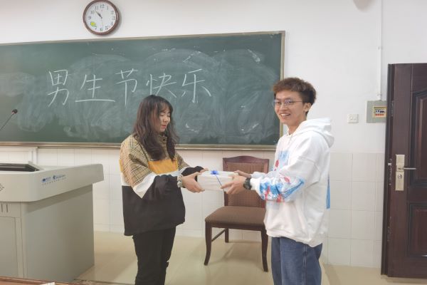 男生节送礼活动开始 ,滕蜜上台简述了活动的内容和流程,并安排10名女生为男生送上礼物,同时女生也表达男女生在今后应相处融洽,男生在以后的团支部活动中可以更加活跃,去实现自己的价值;男生接过礼物后也表达对2002团支部女生的感谢。