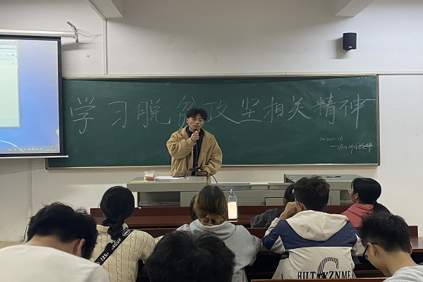 活动开始,余益根简单介绍了本次活动的主题——“学习脱贫攻坚相关精神”,带领同学们观看脱贫攻坚大型纪录片,学习党中央传达的脱贫攻坚相关方针和精神。观影结束,余益根组织同学们分享自身对脱贫攻坚知识内涵的理解。