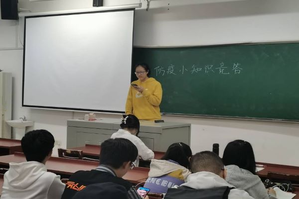 知识竞答活动开始,陈佳怡上台为2002支部的同学们讲述了疫情期间战斗在一线的抗疫英雄的英勇事迹,组织同学们学习抗疫英雄的精神,同时并开展了防疫知识竞答,同学们都积极踊跃的回答了问题,活动结束。