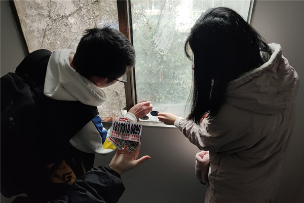 活动开展,陈彪预先观察小区小广告分布情况并向部分小区居民表达小组活动志愿意向。同学们整时在江边女生宿舍前集合并准备好擦除小广告的工具,志分小组分小区单元开展志愿活动,用准备好的水打湿并剔除小广告,以完整除去两栋楼房小广告。