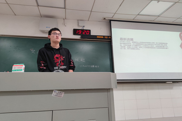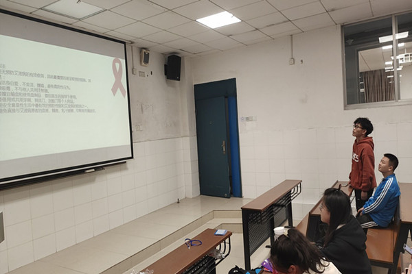 19点整同学们到齐后,青年志愿者委员王仕达主持班会并宣讲演示文档,为大家介绍了艾滋病的历史起源、传播手段、感染症状、预防措施等。会上多次提问有关艾滋病的知识,同学们踊跃回答。会议最后,同学们一起观看了“出圈”节目组最新纪录片《和HIV感染者共处一天》。班长杨树林发表了感想,为班会作结,鼓励大家不要被别人口中的正常不正常所拘束,也不要用正常不正常去区别他人。