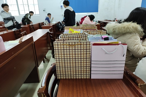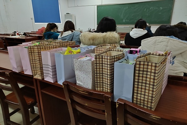 3月8日是属于女生们的节日,余益根安排男生拉横幅并把准备好的礼物安置在课桌上。前来参加活动的女生们挑选自己心仪的礼物,宣传委员谭滕龙指导男女生配对并根据抽签姿势拍照。最后在教室里进行画图你猜游戏,同学们都异常的融洽与开心。