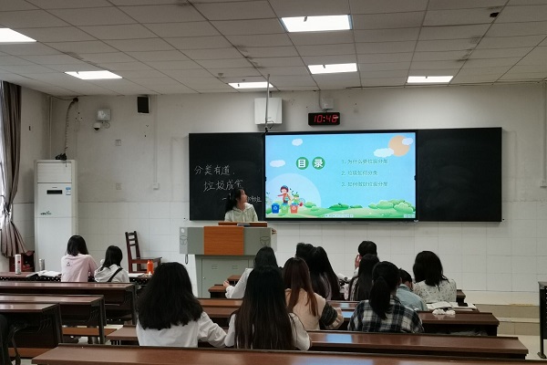 活动伊始,青委王思思组织志愿者们在至善楼102教室开展垃圾分类主题活动班会,讲述垃圾分类的相关知识以及它的重要性。志愿者分享参与此次活动的心得并以QQ说说的形式线上宣传垃圾分类的知识。