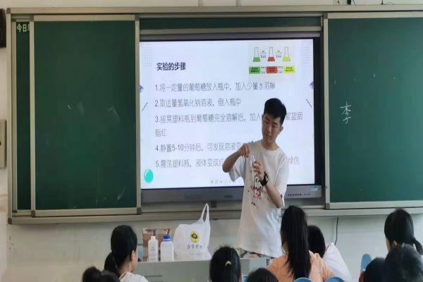 (通讯员 李胜辉)7月11日8时,为初步建立学生们对化学的兴趣,培养学生的动手能力,让学生带着好奇之心去领悟课堂内容,伟德国际1949“青”云直“尚”队在衡阳市常宁市尚宇高级中学开展“化学红绿灯”实验。趣味化学老师李胜辉进行授课,八名助教老师辅助教学指导实验并维持课堂纪律。