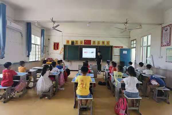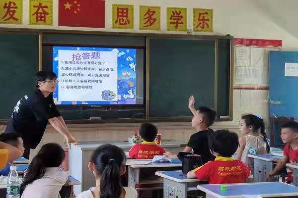 王寻给学生讲解保护环境的意义,并就同学们乱丢垃圾的现象进行批评,同学们端正自己的态度,就自己破坏环境的行为表示悔改。王寻给同学们介绍垃圾分类的基本概念,指引同学选出常见的垃圾并进行分类,提高同学保护环境的意识。课程的最后设置有奖竞答环节,同学举手回答有关垃圾分类的知识,课堂效果良好。