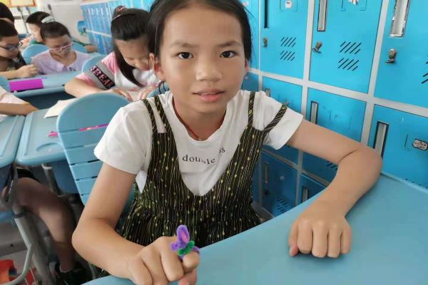 开始上课后,邓思佳寻问同学们是否接触过扭扭棒,大部分同学表示没有接触过。随后,邓思佳给同学们播放制作扭扭棒戒指的教程,其中包括星黛露、草莓熊等卡通动漫形象的制作。同学们积极学习并参与扭扭棒戒指的制作过程,每个同学都制作出属于自己的作品。制作过程中,助教老师帮助同学们完成较为复杂的制作步骤。