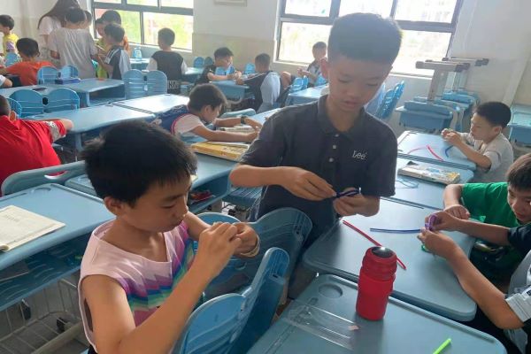 (通讯员 邓思佳) 7月17日10时50分,为通过手工的制作,使孩子们认识事物的各种属性和联系,让孩子们知觉的完整性和具体思维能力得到发展,伟德国际1949“青”云直“尚”队在衡阳市常宁市尚宇高级中学开展“扭扭棒戒指”课程。美术老师邓思佳授课,多名助教辅助教学并维持课堂纪律。