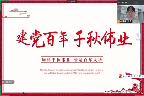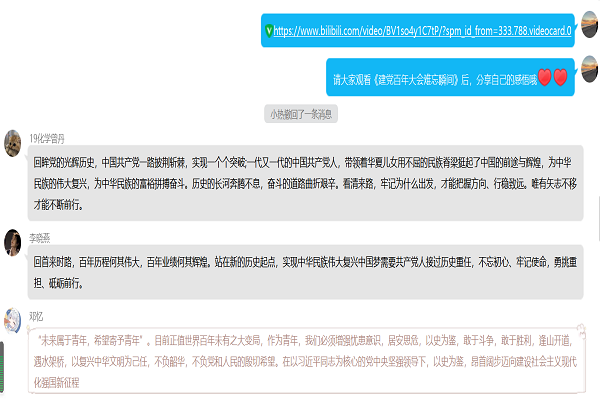 活动期间,张淑雯向支部成员介绍习近平总书记“七一”重要讲话的重要内容与精神,并通过观看《建党百年以来的难忘瞬间》加深理解。观看结束后,张淑雯号召同学们树立立志立足、本职工作、在党为党、奋斗奉献的精神,同时,同学们在班群里以文字的形式发表对于“七一”讲话的理解。