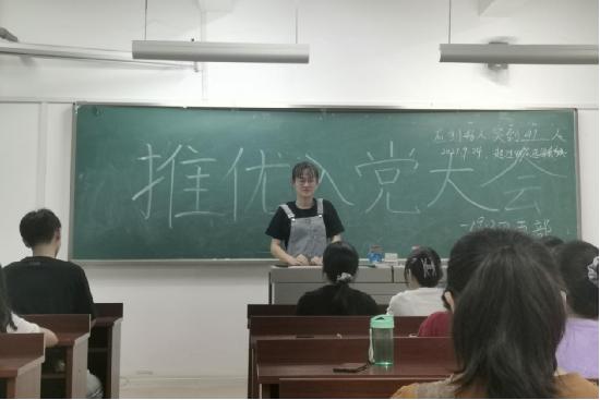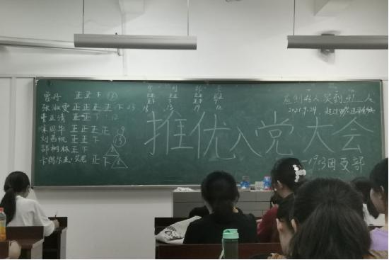 此次会议由团支书张淑雯主持,党支部成员陈博睿担任此次推优入党会议的监察员。七名入党积极分子依次上台自我陈述,表达其对党的热爱和向往,陈述后由支部成员提问,最后由41位成员进行投票。投票采用匿名,结果公平公正。此次推优入党的同学有:张淑雯、宋周华、曹亚清、刘茜帆、邵树林、曾丹、卡得尔亚·艾尼。