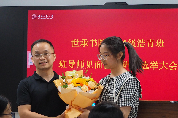 此次班会由浩青班班导罗杰与杨诗薇主持策划,由浩青班班导师杨立山教授担任主讲嘉宾。同学们对与杨立山的见面表现出极高的热情,并以彭凌雪代表浩青班向杨立山献花。