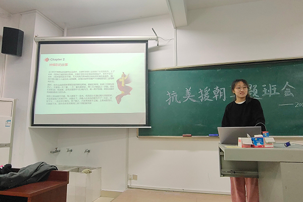 活动内容新颖有趣,为宣传抗美援朝精神,提高同学抗美援朝、保家卫国的政治热情,曾维欣、彭玲丽通过展示网络上的精美剪辑视频,给2004班全体同学传达了抗美援朝时期战士们的爱国精神。同时通过讲述几位抗美援朝烈士的英勇事迹,丰富同学们的历史知识,增强同学们的家国情怀。
