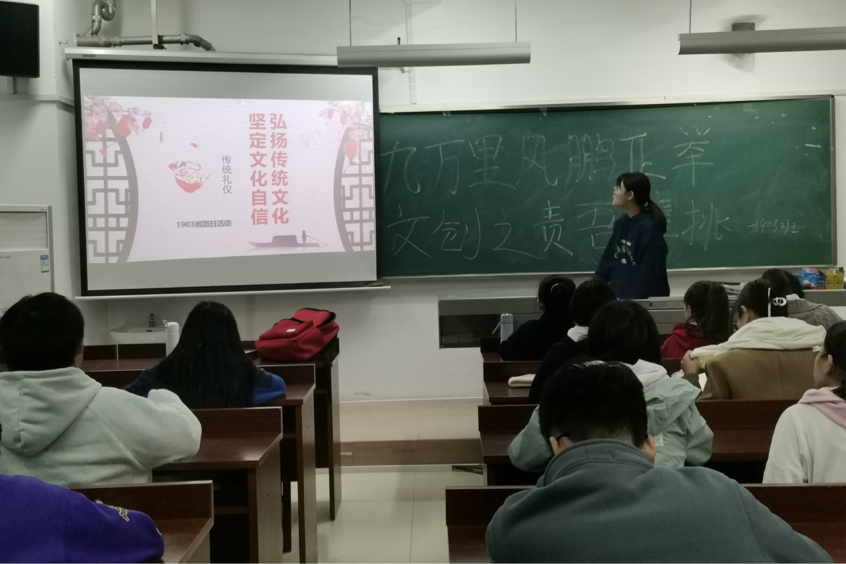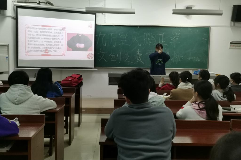 此次活动由团支书张淑雯主持进行,团支书给同学们讲解了行走礼仪、用餐礼仪、见面之礼和拜贺之礼等传统礼仪,还带同学们亲身体验拱手礼,最后引出此次活动的主题,活动结束。