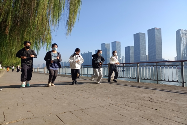 32名志愿者于江边一舍楼下集合,负责人组织签到,并强调相关注意事项,随后志愿者乘坐地铁前往岳麓区橘子洲,有序进入橘子洲景区,在做完热身运动后,沿橘子洲跑道进行晨跑,晨跑结束后,在负责人的组织下志愿者有序开展行走捐,最后在终点处拍照留念。至此活动结束。