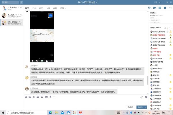 黄紫琦就近年来国家实行“双减”政策,社会风评不一的现象引出话题,启发评论员的思考,并进行讨论。评论员们陈述了对于“双减”政策的看法,提出了对“双减”政策下培训机构和培训老师该何去何从等现实性问题的建议,最后由黄紫琦对此次评论活动进行总结。