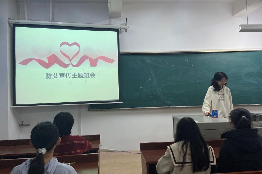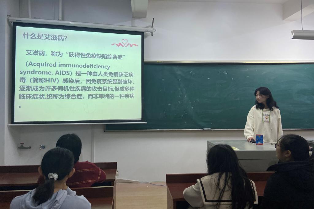 张馨予向大家介绍了艾滋病的传播途径,强调了在大学生中主要是性传播和血液传播,并在PPT上展示了艾滋病的具体症状,同时指出了预防艾滋病的重要性,科普了一些关于艾滋病的基础知识并进行了知识竞答,在详细地告诉大家如何正确预防艾滋病的同时强调了不应区别对待艾滋病患者,应做到“防艾不防爱”。