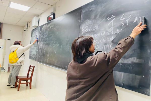 活动开始,志愿者携带劳动工具前往至善楼,沈嘉琳给志愿者分配需要打扫的教室并说明打扫时的注意事项。志愿者前往教室,擦拭桌椅,用湿抹布将黑板擦干净,清理桌兜里残留的垃圾,清除墙壁上的小广告等。打扫完成后,志愿者对教室进行检查,确保干净后前往下一间。活动结束后,志愿者进行拍照留念。