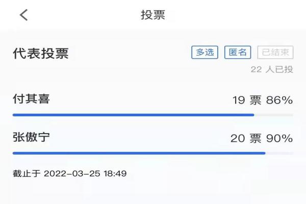 会议伊始,谢云霞指出了此次会议的目的是响应一般院校低收入家庭学生就业帮扶计划,选举出两位就业帮扶对象。随后,付其喜和张傲宁同学依次发言,表明自己的想法。发言结束后,毕业年级团支部全体成员匿名投票,统计出的投票结果为付其喜19票、张傲宁20票。会议的最后,谢云霞简述了目前就业的激烈形势,鼓励同学们做出积极充分的准备面对就业,并提出了相应的建议。