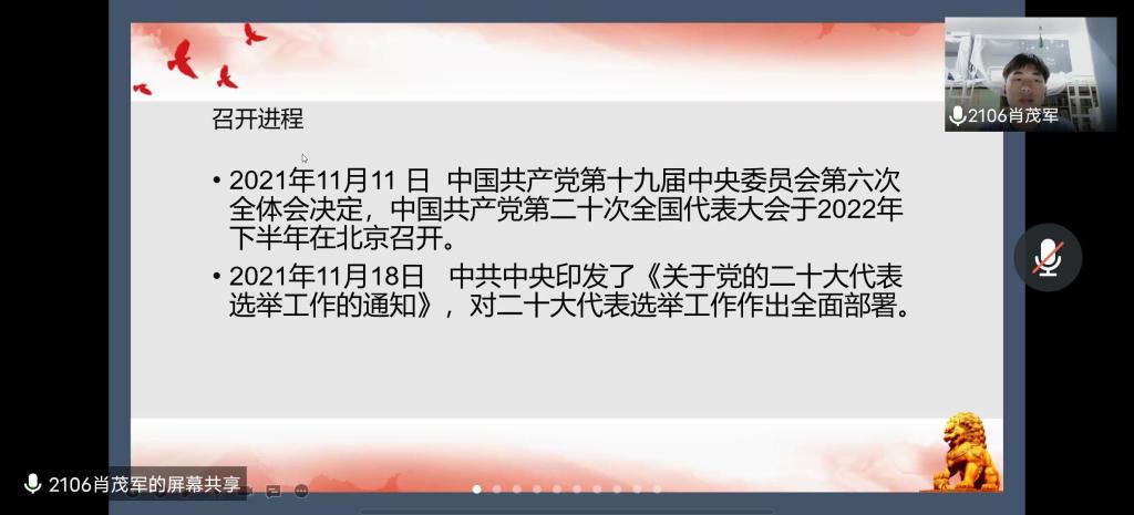 此次团课刘毅作为主持人,继主持人致开场词后,依次由2105至2107班以及21浩青班和社团小组围绕团课主题进行了小组学习成果展示。小组展示通过PPT演示、视频剪辑、演讲等方式进行,分享了各组学习成果,书写了中国青年运动的华章,展示了最积极最有生气的力量。