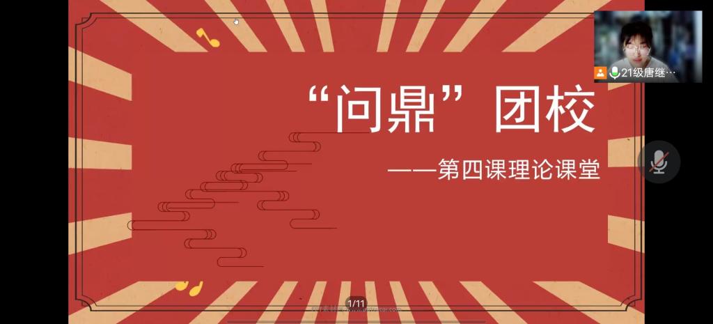 (通讯员 唐继彧)2022年4月2日中午12时30分,第十二届“问鼎团校”第二期理论学习第四课于线上开展。此次团课主题为“与时俱进跟团走,百年奋进展新颜”,与会人员为团校全体成员及院团委青年发展工作部全体成员。