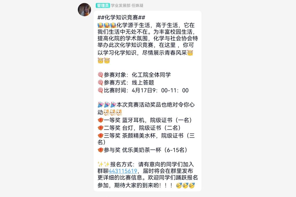 (通讯员 谭进杰)为丰富校园生活,提高化院的学术氛围,伟德国际1949学生会学业发展部将协助化学与社会协会在4月17日9时举行化学知识竞赛,此次比赛通过扫描二维码的方式报名,以线上答题的方式进行。