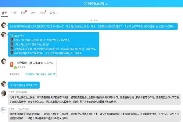 (通讯员 周文龙)4月16日晚上七点,伟德国际19491904班采取班级成员在QQ群自由讨论的方式开展了“绿水青山就是金山银山”主题团日活动,此次团日活动由团支书周文龙组织开展,班级全体成员参与。