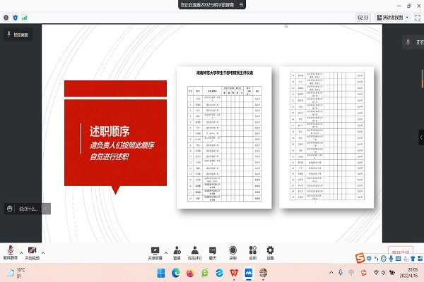 会议伊始,马明宇简单的介绍了本次会议的流程。根据述职顺序,述职人分别从德、能、勤、绩、学五个方面对自己的工作进行总结评价,并对下一阶段的工作进行简要介绍。述职结束后,马明宇对45届团委的工作进行了简单的总结,并结合自己的工作发表了自己的感受。会后,大家根据述职情况进行民主评分,并由办公室收集数据在QQ群内公布结果。
