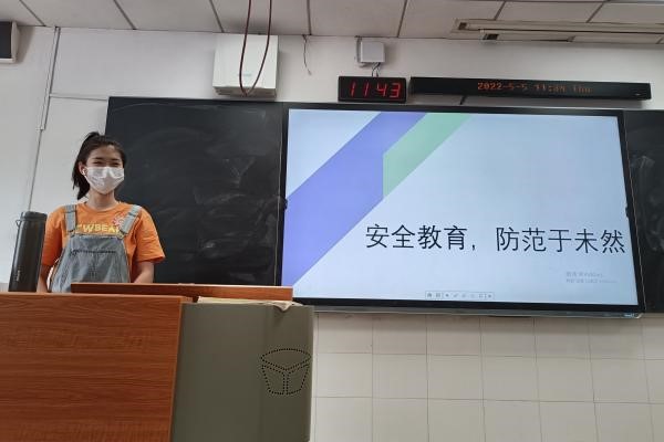 活动伊始,谢培琳讲述了安全教育对于我们每个人的必要性与重要性。随后,谢培琳从远离危房、用电安全与交通安全及防电信网络诈骗三个角度展开,以实事案例出发,告诉同学们遇险的应对措施。最后,谢培琳和同学们分享了自己对于安全防范的思考与感悟。