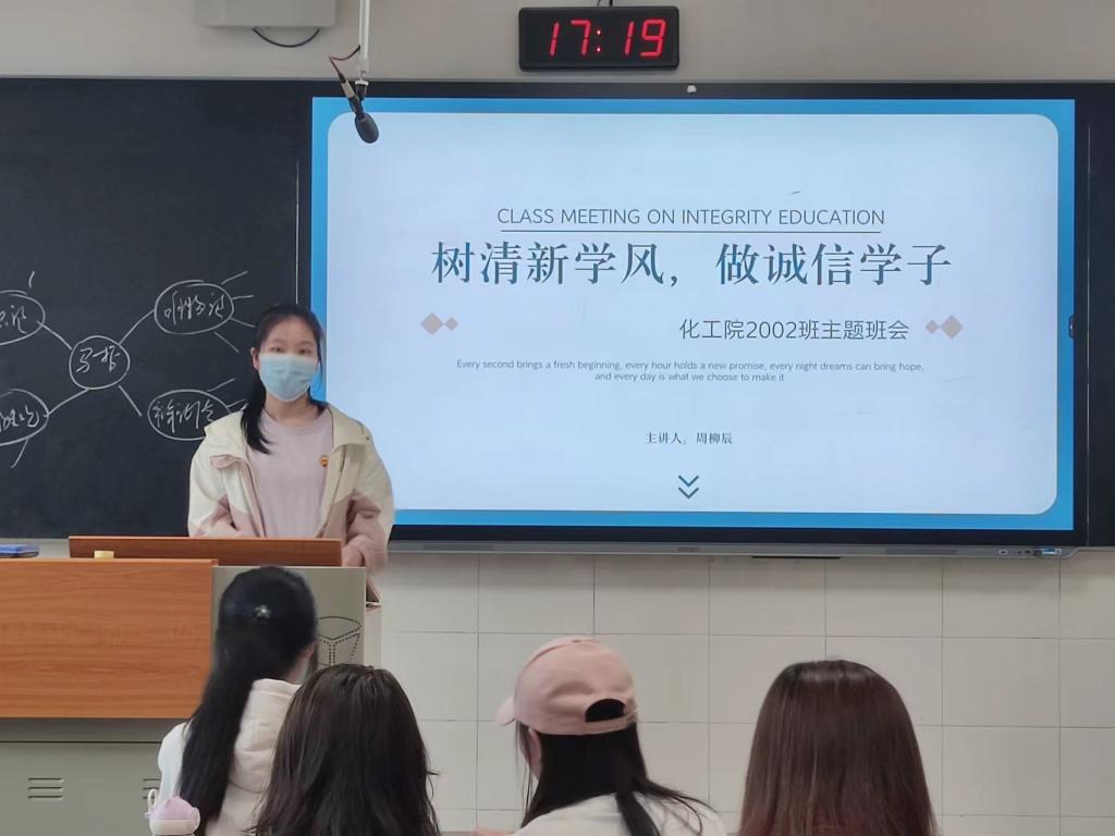 (通讯员 周柳辰)5月16日17时20分,伟德国际19492002班在至善楼101教室举行主题为“树清新学风,做诚信学子”的班会,此次活动由生活委员周柳辰,2002班全员参与。