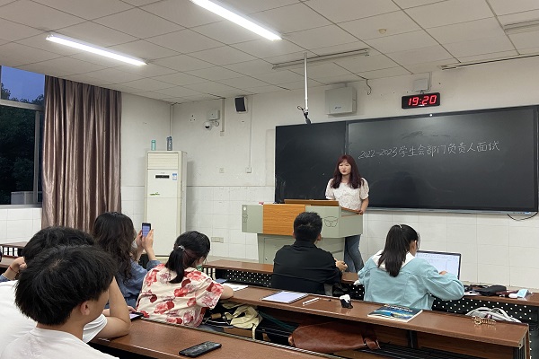 面试过程中,院学生会主席与各部门负责人主要从实践经验、个人能力、如何处理人际关系及与他人沟通、对竞选部门的未来规划等方面进行提问,通过面试者的回答,结合面试者的其它各个方面整体考量,对学生会新一届部门负责人进行筛选。