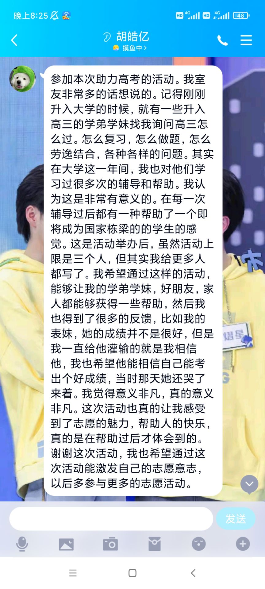 此次活动受疫情形势影响,为了配合防疫工作,减少人员聚集,同时也为了方便志愿者进行联系,采用了线上举办的方式。此次活动主要内容为为即将高考的高三学子送上建议和祝福,分享自己的应试技巧和心理自我调节方式,同时为高三同学进行线上答疑,辅助解决相关知识的疑问。