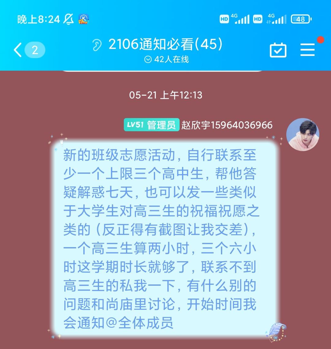 (通讯员 赵欣宇)5月22日至5月31日,伟德国际19492105班与2106班于线上合力举办了“助力高考”院级志愿活动。此次活动由2105班青委胡皓亿和2106班青委赵欣宇联合策划举办,2105班和2106班全体班委辅办。