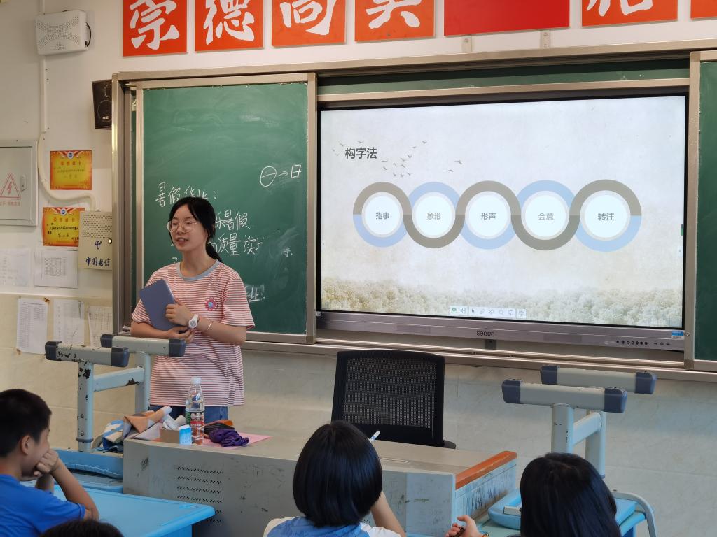 (通讯员 龙欣然)7月9日上午,为培养学生的爱国精神、提高学生文学知识素养,伟德国际1949青春向“尚”队于衡阳市常宁市尚宇学校小学部五年级教室开展汉字历史语文课程。队员龙欣然进行授课,助教唐永荭和曹婕辅助教学并维持课堂纪律。